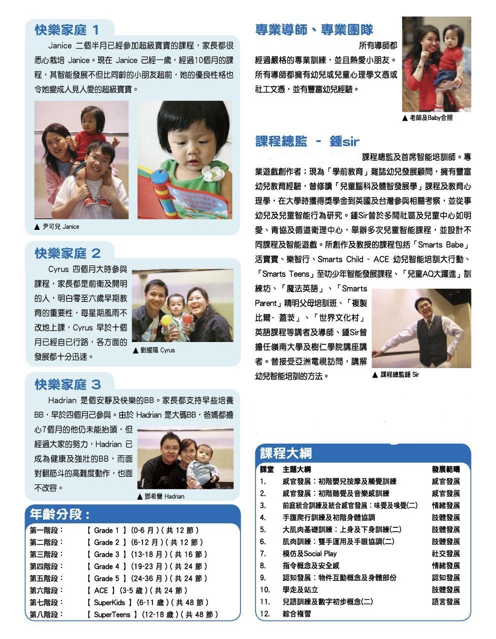 HK Superlearning課程總監及首席智能培訓師。專業遊戲創作者;曾為「學前教育」雜誌幼兒發展顧問,並編寫專欄,擁有豐富幼兒教育經驗,曾修讀「兒童腦科及體智發展學」課程及教育心理學,在大學時獲得獎學金到英國及台灣參與相關考察,並從事幼兒及兒童智能行為研究。Chung Sir曾於多間社區及兒童中心如明愛、青協及循道衛理中心,舉辦多次兒童智能課程,並設計不同課程及智能遊戲。所創作及教授的課程包括「Super Babe」活寶寶、樂智行、Super Child - ACE幼兒智能培訓大行動、「Super Teens」至叻少年智能發展課程、「兒童AQ大躍進」訓練坊、「魔法英語」、「Super Parent」精明父母培訓班、「複製比爾o蓋茨」、「世界文化村」英語課程等講者及導師、Chung Sir曾經擔任嶺南大學及樹仁學院講座講者,並在不同機構如青協、明愛、幼稚園及經濟通主講講座。Chung Sir培育過超過10000個寶寶,年齡最少為2個半月幼兒,並有超過22年的教會經驗。